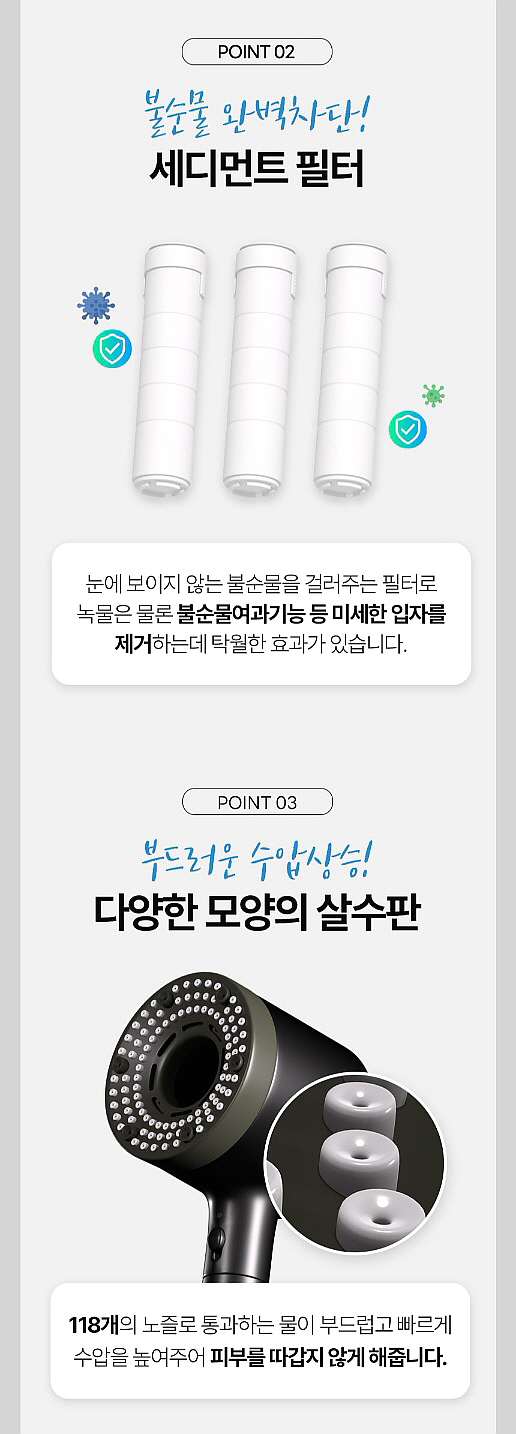 수압상승,정수,절수,녹물제거,마사지,불순물제거,물줄기변경 다수의 기능을 가진 디자인 샤워헤드