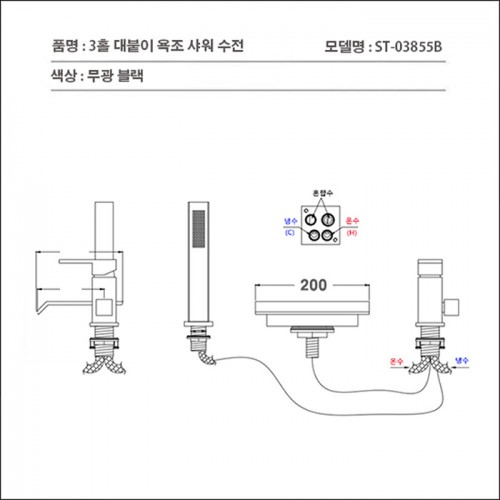 ST-03855B 무광 블랙 3홀 대붙이 데크형 폭포 욕조 샤워 수전 수도꼭지