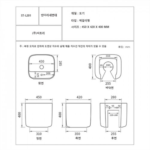 ST-L201H 사각 반다리 벽걸이 벽붙이 세면대 세면기