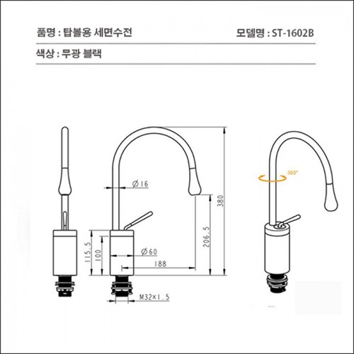 ST-1602B 무광 블랙 물방울모양 탑볼용 탑볼 세면대 세면기 수전 수도꼭지