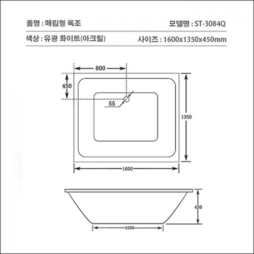 ST-3084Q 1600x1350 대형 아크릴 직사각 매립식 매립형 빌트인 다운 욕조
