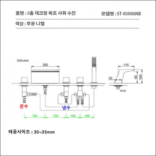 ST-05006NB 무광 니켈 5홀 데크형 폭포 욕조 샤워 수전 수도꼭지 요약정보 및 구매
